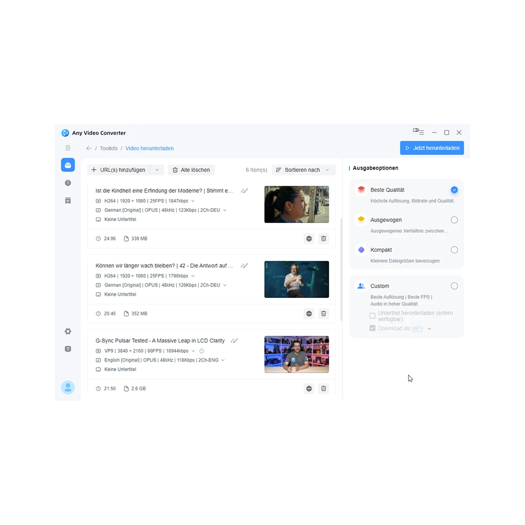 Kopieren Sie einfach einen Videolink aus dem Browser. Any Video Converter erkennt diesen und fügt ihn automagisch in eine Liste ein. Sobald Sie alle Links ausgewählt haben, wählen Sie Ihre Einstellungen und laden Sie die Titel herunter.