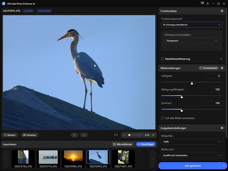 AI Hintergrund entfernen: Erkennt und entfernt Hintergründe präzise und ersetzt diese durch eine Farbe oder ein Bild.