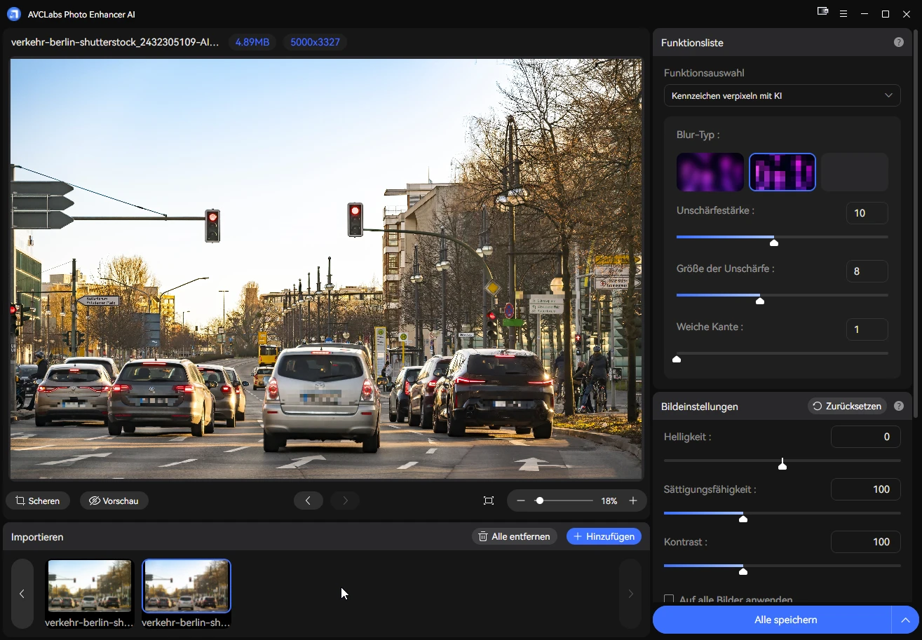 AI Kennzeichen verpixeln: Erkennt und verpixelt Kennzeichen automatisch, anpassbar in Stärke und Typ