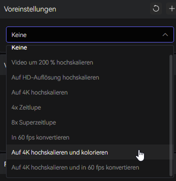 Vorkonfigurierte Presets erleichtern den Einstieg und decken typische Szenarien wie „Auf 4K skalieren und kolorieren“ ab. Eigene Einstellungen können als Presets gespeichert und auf viele Videos per Stapelverarbeitung angewendet werden. So verbessern Sie ganze Videoarchive mit wenigen Klicks und sparen viel Zeit im täglichen Workflow.