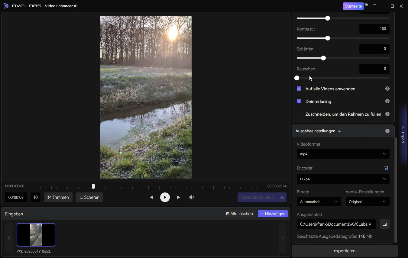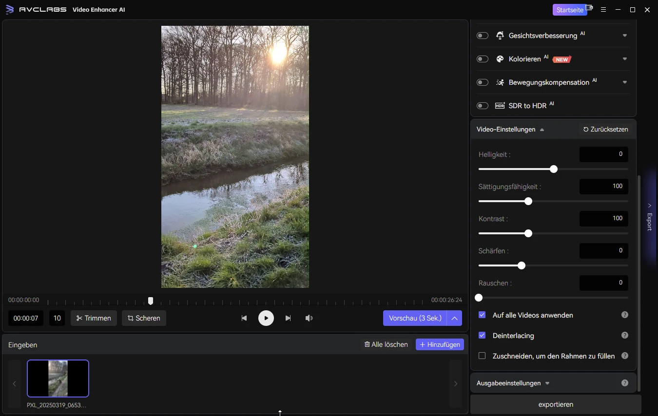 Helligkeit, Kontrast, Sättigung, Schärfe und Beschnitt lassen sich gezielt anpassen, inklusive Deinterlacing und Zuschnitt auf Vollbild.