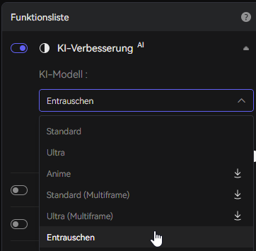 Sie können zwischen verschiedenen AI Enhancement‑Modellen wählen, darunter Standard, Ultra, Anime und Multi‑Frame‑Varianten. Standard eignet sich für längere Projekte mit Fokus auf Geschwindigkeit, während Ultra maximale Qualität priorisiert. Multi‑Frame‑Modelle reduzieren Bildflackern und Jitter, indem mehrere Frames gleichzeitig analysiert werden.