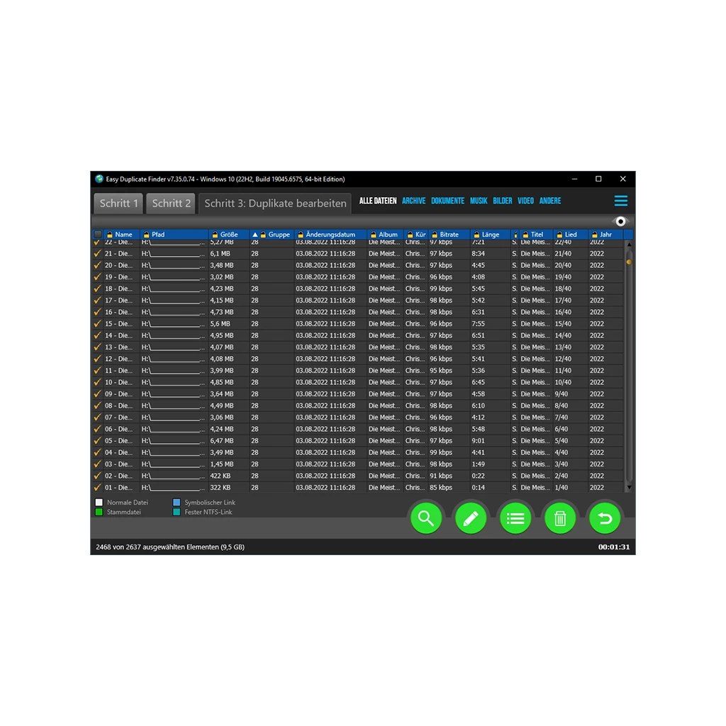 Im dritten und letzten Schritt werden Ihnen alle Duplikate bzw. auf Wunsch nur bestimmte Dateitypen, z.B. Videos, angezeigt. Dann können Sie anhand der Eigenschaften der Dateien entscheiden, ob Sie die als Duplikat gekennzeichnete Datei noch benötigen.