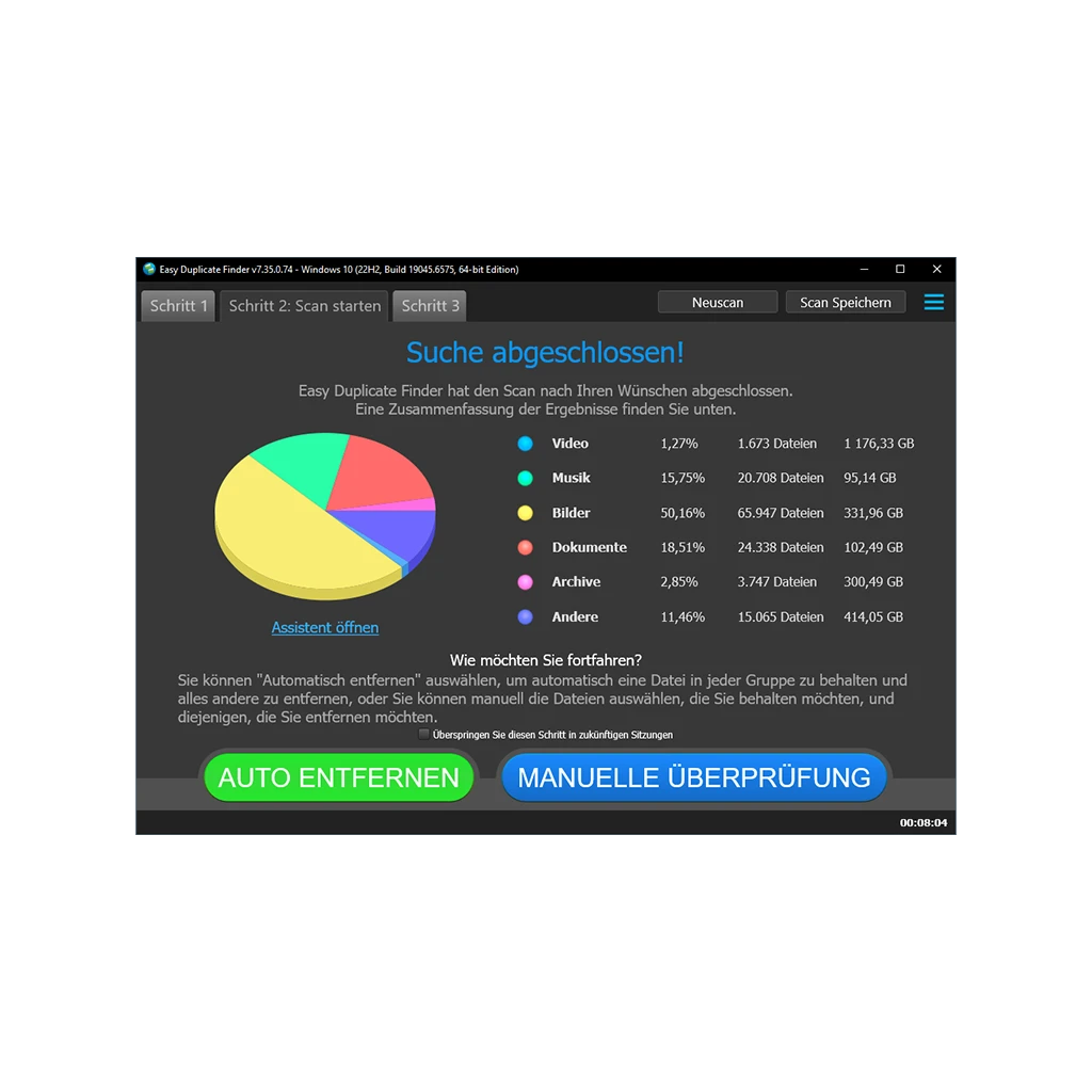 Jetzt läuft der vollautomatische Scan nach Ihren Vorgaben im vorherigen Schritt ab. Am Ende werden Anzahl und Art der Duplikate sowie der von den Dubletten belegte Speicherplatz angezeigt.